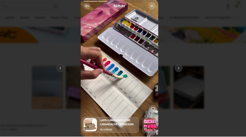 Após a instalação do Replay, vários itens passaram a ter vídeos mostrando o material em uso, o tipo de traço, a cobertura da tinta e outros detalhes importantes para quem já conhece esse tipo de produto. Isso fez diferença principalmente na linha premium e nos artigos usados para desenho e pintura, onde a escolha depende muito do acabamento e do resultado final.