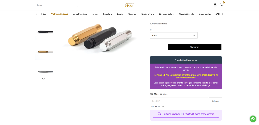 | Prazo | Sem informação clara para o cliente | Prazo visível na página de cada produto |