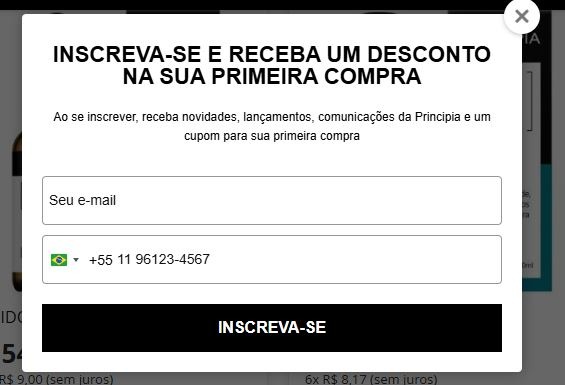O pop-up com desconto na entrada do site é mais um recurso estratégico, funcionando como um incentivo imediato para a primeira compra. Essa ação ajuda a capturar a atenção do visitante logo no início da navegação.