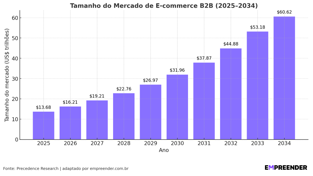 O comércio entre empresas está passando por uma das maiores transformações de sua história. Segundo dados da Precedence Research, o mercado de e-commerce B2B movimentará cerca de US$ 13,68 trilhões em 2025 e deve ultrapassar US$ 60 trilhões até 2034, crescendo a uma taxa anual próxima de 18%. Conforme gráfico abaixo: